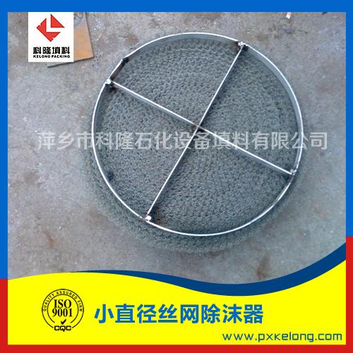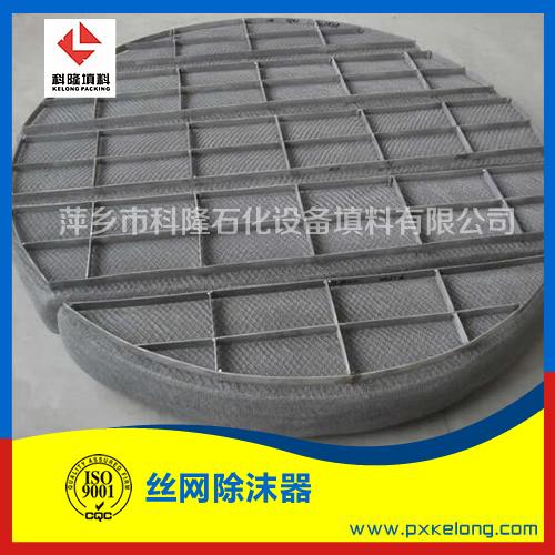丝网除沫器 ,又名丝网除雾器、丝网捕沫器、除沫器。用于分离气体中夹带的液滴直径大于3-5μm的雾沫。当带有雾沫的气体以一定的速度上升,通过格栅中间的过滤丝网时,由于雾沫上升的惯性作用,使得雾沫与细丝碰撞而粘附在细丝的表面上。细丝表面上的雾沫进一步扩散及雾沫本身的重力沉降,使雾沫形成较大的液滴沿着细丝流至它的交织处。由于细丝的可湿性、液体的表面张力及细丝的毛细管作用,使得液滴越来越大,直至其自身的重力超过气体上升的浮力和液体表面张力的合力时,就被分离而下落。只要操作气速等条件选择得当,气体通过丝网除沫器后,其除沫效率可达到99%以上,可以达到完全去除雾沫的目的。