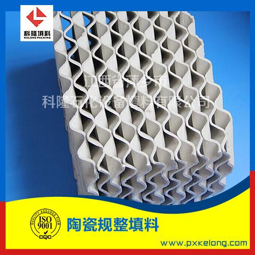 陶瓷规整填料是一种在塔内以均匀几何图形排布,整齐堆砌的塔填料。它规定了气液流路,改善了沟流、壁流和润湿性能,降低了阻力,同时提供更多的气液接触面积从而提高了传质、传热效果。