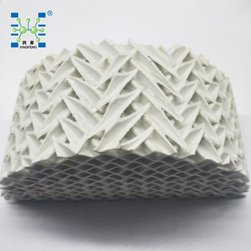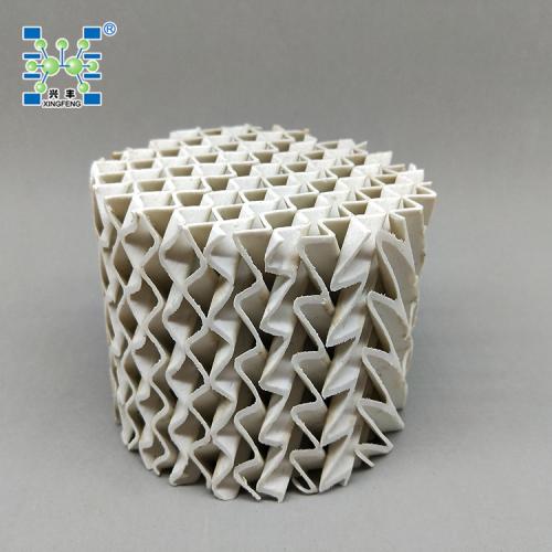 陶瓷规整波纹填料是继金属孔板波纹填料开发应用之后开发的孔板波纹填料。它质轻、通量大,适宜大容积塔器。