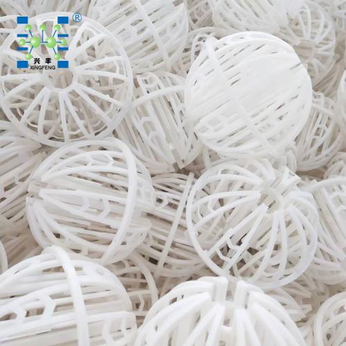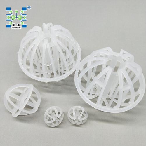 塑料环保球采用聚丙乙烯塑料制成球状,在球中部沿整个周长有一道加固环环的上下各有十二片球瓣,沿中心轴呈放射形布置,适用于二氯化碳脱气塔,接触反应塔等装置。环保球耐腐蚀性能好、空隙大、通量大、阻力小、能耗低、且重量轻、易装卸、可重复使用、操作费用低等特点。环保球(TRI)填料的特点是在填料有本体没有任何一块大的表面,而是由许多格栅状的枝条棒联接组合成为一个空心球体,此种填料不但空隙率高而且各个方面的自由截面积很大,向异性很小。由于许多格栅状的枝条棒联接组合而成,又为下流的液体提供许多流动的汇聚分散边缘,不但使填料表面能很好的润湿,而且可使液体形成许多微滴,可促进液体的表面更新,有利于气液两相间的传质。可广泛用于气体吸收,净化还可用于除雾器。