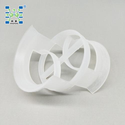 塑料共轭环填料吸收了鞍型填料和环型填料的优点,且结构更加紧凑对称。共轭环填料相当于将阶梯环沿轴向对半剖开,然后将其中的一半倒转108°连接而成,其中每个半圆形构件中间又又一个半环形肋片。共轭环填料肋的作用是增大传质表面积,改善传质性能,防止填料散装时填料体之间发生叠合。 共轭环填料的特点是由于内肋呈共轭状,对称性较高,在塔内堆放时很均匀,不会发生沿轴向的重叠的现象。故使液体在填料表面能达均匀分布;相邻填料的内肋与表面接触点多,强化肋液体的汇聚和分散,促进了气液接触的表面更新。共轭环填料这些特点使得共轭环填料具有压降小,气液接触表面积大,流体力学和传质性能优良等特点。