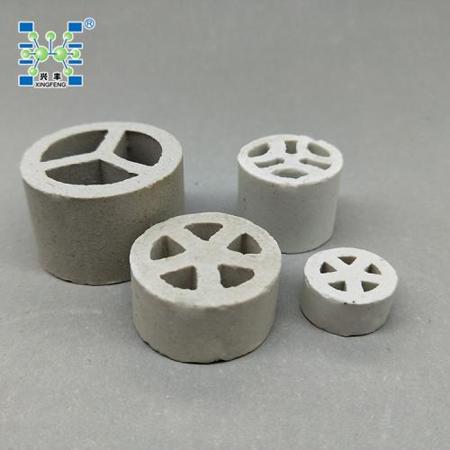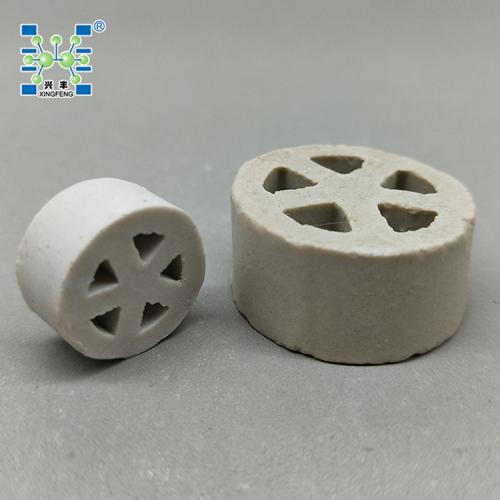 车轮形保护剂主要采用优质工业氧化铝粉,经煅烧、粉碎、配料、球磨制泥、陈腐、挤出成型、干燥、烧成等系列生产工艺精细加工而成。产品具有耐高温,耐急冷急热性能较惰性瓷球优良。一般陶瓷耐温达1280℃,刚玉质耐高温达1650℃。车轮形保护剂是我公司在综合国外技术的基础上采用了独特的结构设计,将支撑剂做成内部五个孔(车轮状),使之具有拱桥效应,产品承受的增载荷能力大大增强,内部的三角孔,可以提高空隙率和比表面积,从而降低了催化剂床层的压降。将该保护剂与同类产品进行对比实验,结果表明,与传统支撑剂相比,强度提高25% ,空隙率提高得到更大的提高。