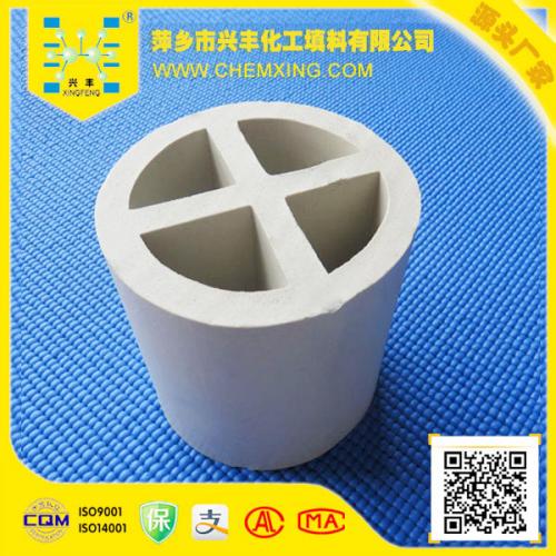 十字隔板环填料是基于增加填料的比表面积,从而强化传质效率而开发出来的。其形状是在拉西环中间增设了十字隔板。一般来讲,这种填料由于尺寸较大,仅适用于整体堆砌,目前一般只作为乱堆填料的塔底支撑分布层用.