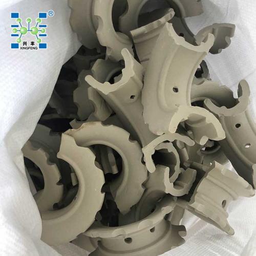 陶瓷异鞍环填料是在矩鞍环填料的基础上加以改进的新型填料,将矩鞍填料的平滑弧形侧面改为锯齿形或纹纹凸起的侧面。这样在填料床层内,增加了填料间接触的空隙,使之更有利于气体和液体在填料层中的流动和扩散,具有压降低,传质效率高等特点,广泛应用于硫酸生产的干燥塔和吸收塔中。