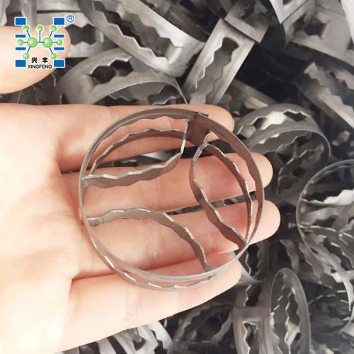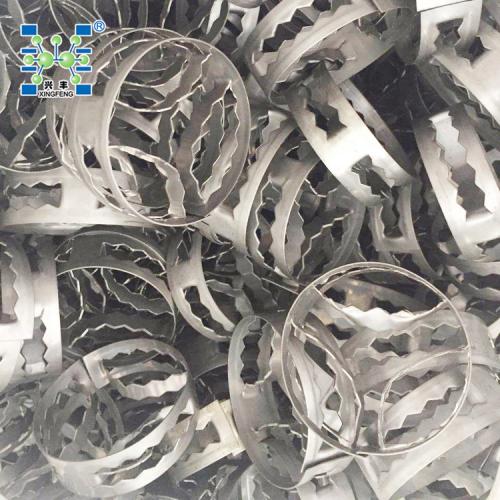 金属扁环填料,属于短开孔环型填料,简称SMR(Super Mini Ring ),此填料用于低界面张力体系的液液萃取过程,轴向混合小,处理能力大,其传质效率可提高20%以上;用于中等界面张力体系的液液萃取过程时,其笔负荷可达50~60m 3/(m2.h);此种填料也可适用于气液传质过程。