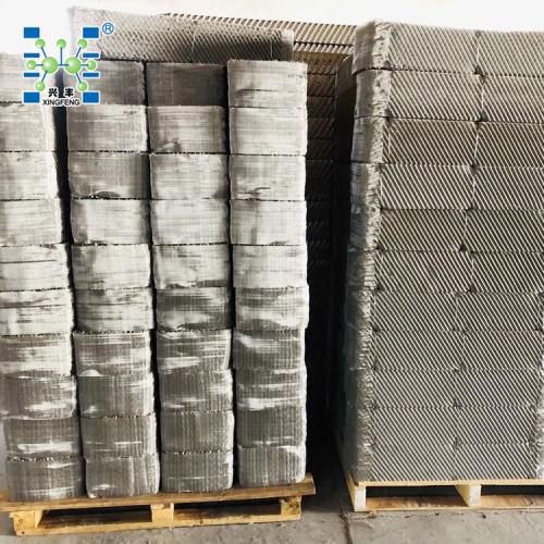 金属丝网波纹填料是目前世界各国应用比较广泛的高效填料,它是由若干平行直列的金属波纹网片排列组成的圆盘状填料。它具有比表面积大、孔隙率大、重量轻;气相通路倾角小、有规则、压降低;径向扩散良好、气体接触充分等特点。