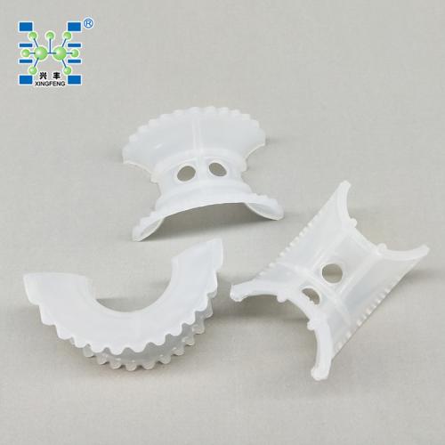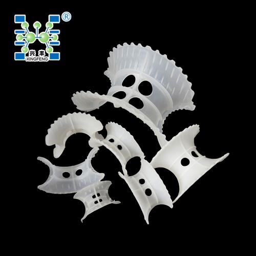 塑料异鞍环填料是对矩鞍环的改进,它的特点是将扇形弧面改进成带锯齿边缘的贝壳状弧面,并增加开孔使填料内外表面沟通、增加流体的自由通道。塑料异鞍环填料有利于液体分布和表面的更新,故较矩鞍环的处理能力高,压降小、传质性能有所改善。 塑料异鞍环填料类似于马鞍形状,这种填料层中主要为弧形的液体通道,填料层内的空隙较环形填料(尤其较拉西环填料)更加连续,可使气体向上流动时主要沿弧形通道流动。