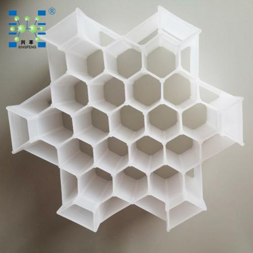 我公司生产的塑料棱形多孔组合环小型规整填料因设计了隔离支脚,它可使上下相邻两层填料以一定距离相互隔离,而使上层底面与下层顶面不相重叠,从而增加了自由体积和传质面积,而且可以使煤气每穿过一次填料后,都要重新混合和分配一次,这就使得煤气不断均匀化,很好地改善了气液界面条件,提高传质效率。