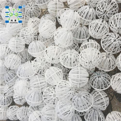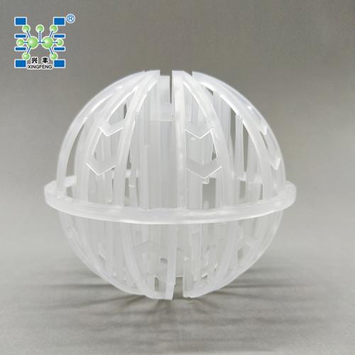 塑料环保球采用聚丙乙烯塑料制成球状,在球中部沿整个周长有一道加固环环的上下各有十二片球瓣,沿中心轴呈放射形布置,适用于二氯化碳脱气塔,接触反应塔等装置。环保球耐腐蚀性能好、空隙大、通量大、阻力小、能耗低、且重量轻、易装卸、可重复使用、操作费用低等特点。环保球(TRI)填料的特点是在填料有本体没有任何一块大的表面,而是由许多格栅状的枝条棒联接组合成为一个空心球体,此种填料不但空隙率高而且各个方面的自由截面积很大,向异性很小。由于许多格栅状的枝条棒联接组合而成,又为下流的液体提供许多流动的汇聚分散边缘,不但使填料表面能很好的润湿,而且可使液体形成许多微滴,可促进液体的表面更新,有利于气液两相间的传质。可广泛用于气体吸收,净化还可用于除雾器。