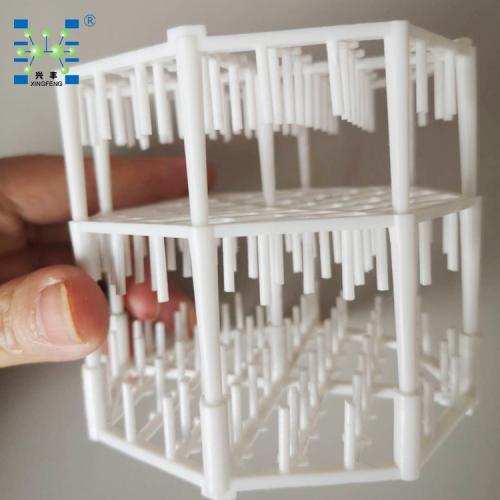 Q-PACK的流通结构利用滴尖和气体紊流来制造无数的液滴,在小限度阻碍气流通过的情况下,指数倍的增加了气液接触的面积。它的空隙率很高,可达到96.3%,而且它方向一致的空间网络结构使得细小的固体颗粒可以顺利通过而不至于堵塞其中。这些洗涤效率,气体通过能力和抗堵塞能力的优势都是其他填料塔无法与之匹敌的。
