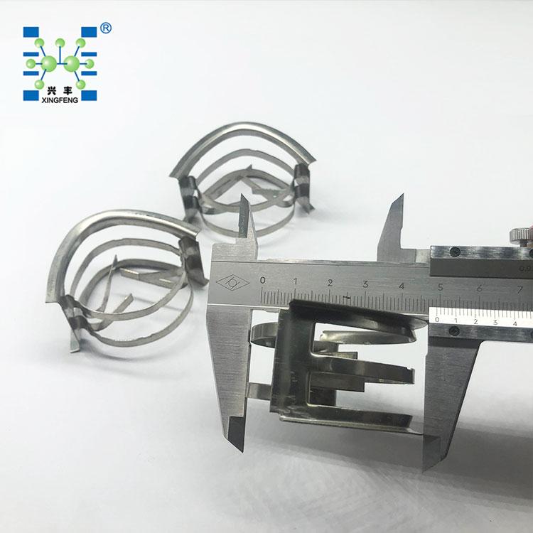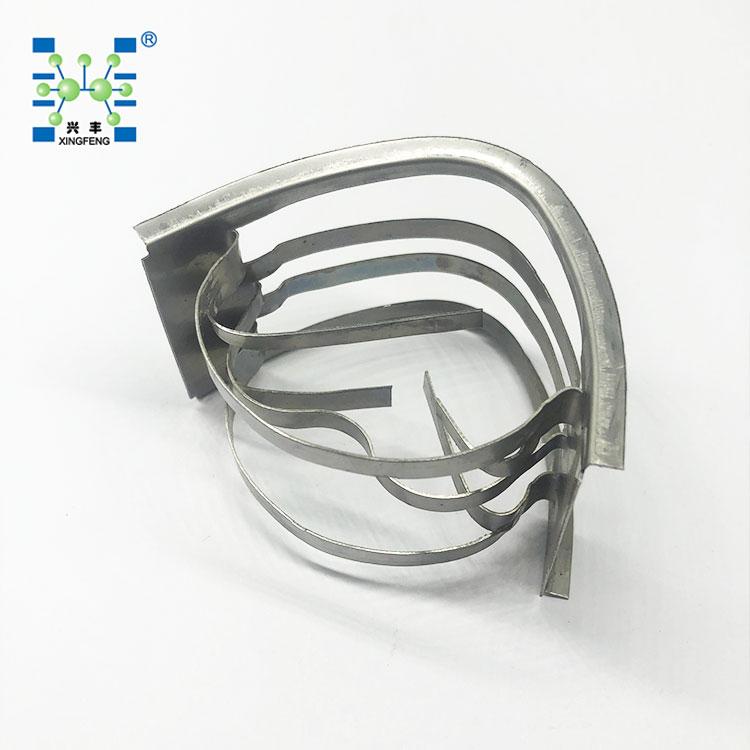 金属矩鞍环填料是美国Norton公司开发的,它的形状介于环形与鞍形之间,因而兼有两者之优点。结构上金属矩鞍环填料在鞍形基础上增加了环形筋,避免了重迭,保证了一定的强度与刚性,冲出了几个小爪,增加了气液搅动,强化了传质,从而产生了特别的性能。