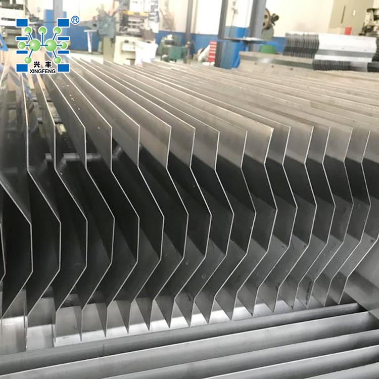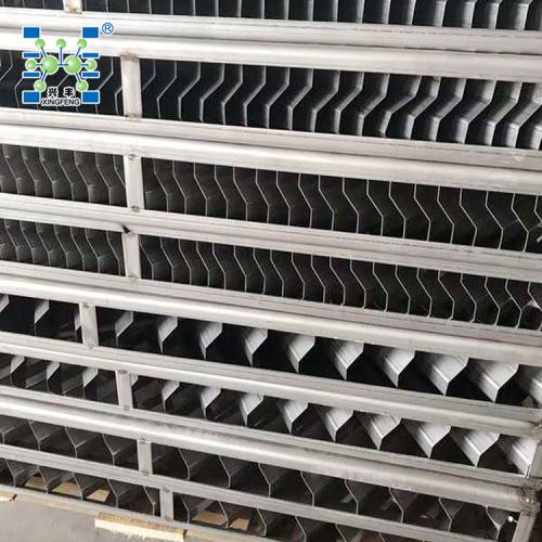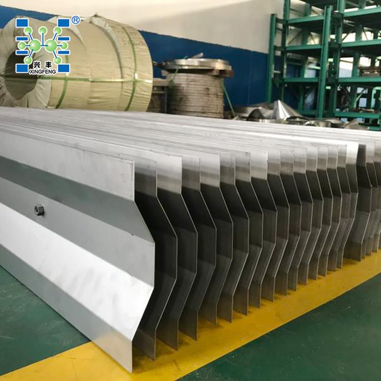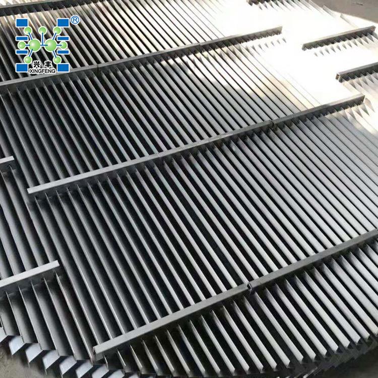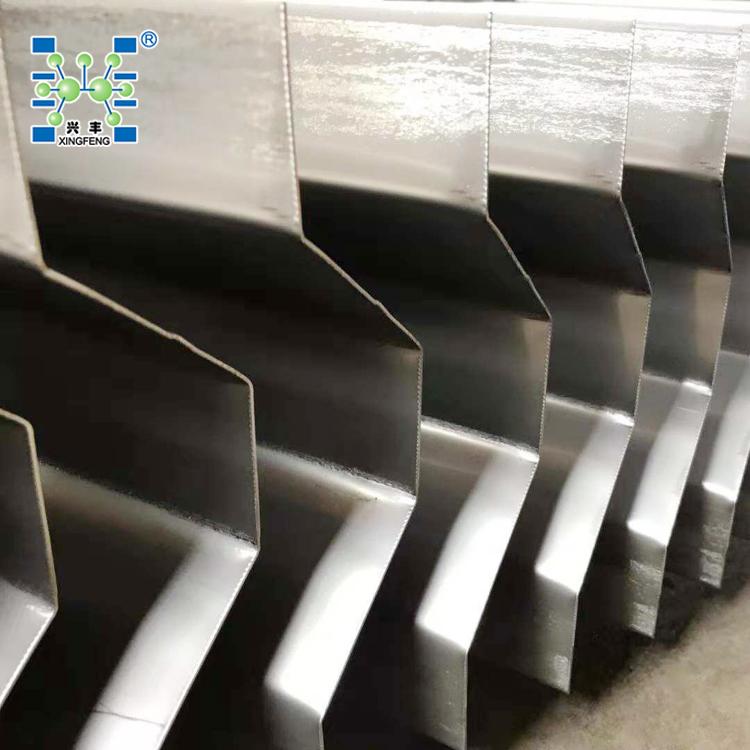 (2)除雾器叶片间距 叶片间距的大小,对除雾器除雾效率有很大影响。随着叶片间距的增大除雾效率降低。板间距离的增大,使得颗粒在通道中的流通面积变大,同时气流的速度方向变化趋于平缓,而使得颗粒对气流的跟随性更好,易于随着气流流出叶片通道而不被捕集,因此除雾效率降低。 除雾器叶片间距的选取对保证除雾效率,维持除雾系统稳定运行至关重要。叶片间距大,除雾效率低,烟气带水严重,易造成风机故障,导致整个系统非正常停运。叶片间距选取过小,除加大能耗外,冲洗的效果也有所下降,叶片上易结垢、堵塞,***终也会造成系统停运。叶片间距根据系统烟气特征(流速、SO2含量、带水负荷、粉尘浓度等)、吸收剂利用率、叶片结构等综合因素进行选取。叶片间距一般设计在20~95mm。目前脱硫系统中***常用的除雾器叶片间距大多在30~50mm。