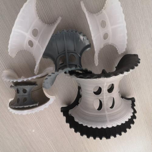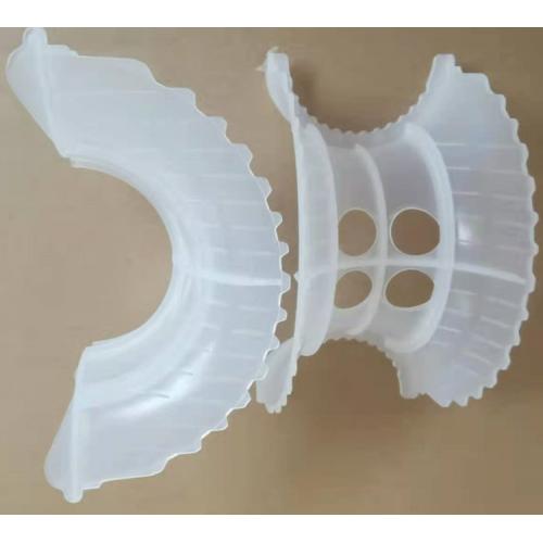 该产品外形结构是对塑料矩鞍环的改进。其特点是将扇形弧面改进成带锯齿边缘的贝壳状弧面,并增加开孔使填料内外表面沟通、增加流体的自由通道,有利于液体分布和表面的更新,故较矩鞍环的处理能力高,压降小、传质性能有所改善。该填料类似于马鞍形状,填料层中主要为弧形的液体通道,填料层内的空隙较环形填料(尤其较拉西环填料)更加连续,可使气体向上流动时主要沿弧形通道流动。