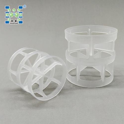 塑料鲍尔环填料是一种高径相等的开孔环型填料,每层窗孔有5个舌叶,每个舌叶内弯指向环心,上下两层窗孔的位置相反错开,一般开孔面积约占环壁总面积的30%左右。具有空隙率大,压降和传质单元高度低,泛点高、汽液接触充分、比重小、传质效率高等特点。