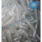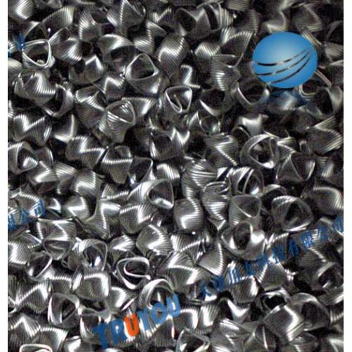 三角螺旋填料,用金属丝绕制而成的,其外形与弹簧相似,又称三角形弹簧填料。它与弹簧的区别在于绕制的每一圈不是圆形而是三角形,圈与圈之间的三角形错开一定的角度,因此从端面方向看是一个多角形。这种填料效率较高,但与环形填料相比,阻力略大,广泛应用于实验室规模的同位素分离研究。